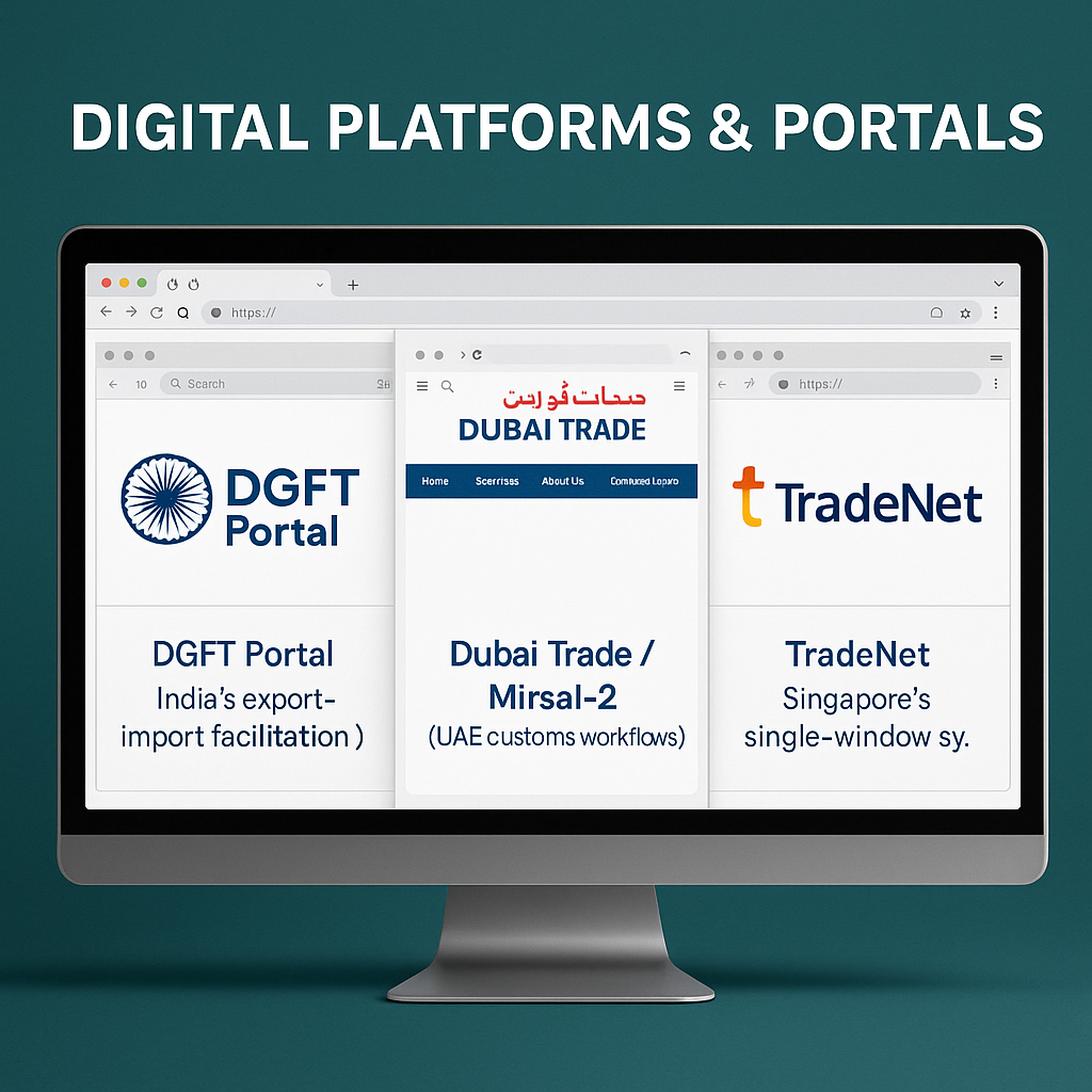 Build familiarity with DGFT portals (India), Dubai Trade (UAE), and Singapore’s TradeNet system, along with insights into FTP 2023 schemes.