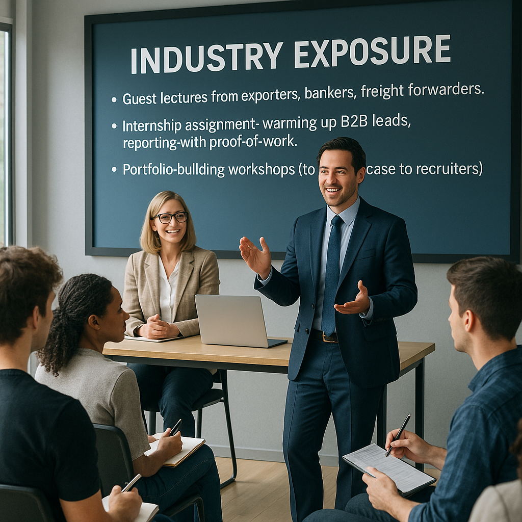 Participate in role-plays and live simulations that replicate the challenges of export houses, logistics companies, and trade finance desks.
